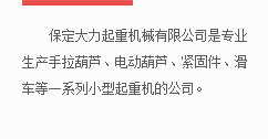 保定大力起重機械有限公司是專業生產手拉葫蘆、電動葫蘆、緊固件、滑車等一系列小型起重機械的公司。